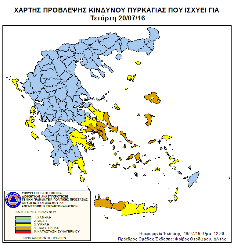 Σύμφωνα με το χάρτη πρόβλεψης κινδύνου πυρκαγιάς που εξέδωσε η Γενική Γραμματεία Πολιτικής Προστασίας για αύριο, Τετάρτη 20 Ιουλίου 2016 προβλέπεται πολύ υψηλός κίνδυνος πυρκαγιάς (κατηγορία κινδύνου 4) σε ολόκληρο το Νομό Χανίων.