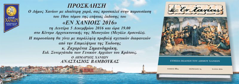 02/12/2016, Παρουσίαση της ετήσιας έκδοσης του Δήμου Χανίων «ΕΝ ΧΑΝΙΟΙΣ 2016» στις 5/12/2016 στο Κ.Α.Μ.