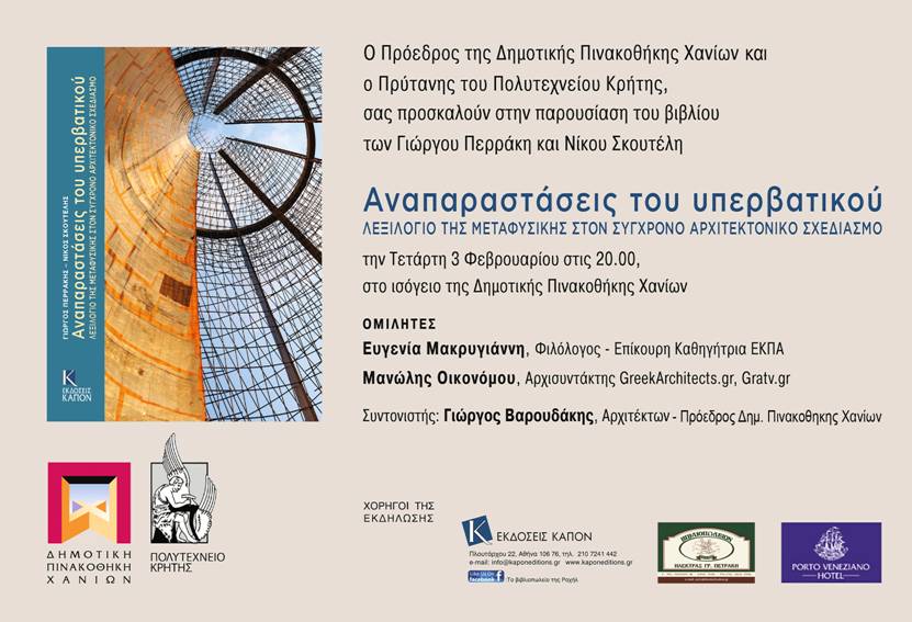 Το βιβλίο των Γιώργου Περράκη και Νίκου Σκουτέλη "Αναπαράσταση του υπερβατικού. Λεξιλόγιο της Μεταφυσικής στον σύγχρονο αρχιτεκτονικό σχεδιασμό", θα παρουσιαστεί την Τετάρτη 3/2/2015, στο ισόγειο της Δημοτικής Πινακοθήκης Χανίων.