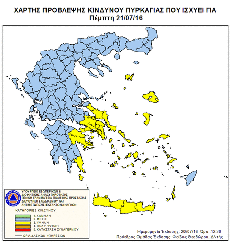 Σύμφωνα με το χάρτη πρόβλεψης κινδύνου πυρκαγιάς που εξέδωσε η Γενική Γραμματεία Πολιτικής Προστασίας για την Πέμπτη 21/7/2016 προβλέπεται υψηλός κίνδυνος πυρκαγιάς (κατηγορία κινδύνου 3 ) σε ολόκληρο το Νομό Χανίων. Αυτό σημαίνει ότι είναι πιθανόν να εκδηλωθεί αυξημένος αριθμός πυρκαγιών, αρκετές από τις οποίες θα είναι δύσκολο να αντιμετωπιστούν όταν οι τοπικές συνθήκες είναι ευνοϊκές.