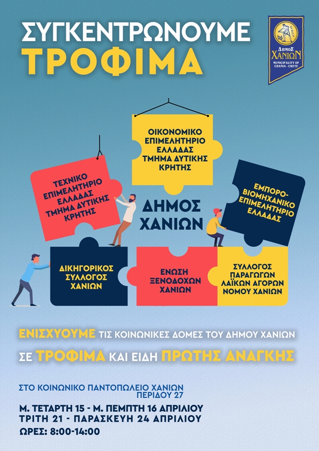 Ο Δήμος Χανίων σε συνεργασία με θεσμικούς φορείς του τόπου μας ενώνουν τις δυνάμεις τους σε μια προσπάθεια να ενισχυθούν οι κοινωνικές δομές του Δήμου αλλά και ο κάθε πολίτης που είτε μέσα από τη γραμμή υποστήριξης του 15240 είτε μεμονωμένα ζητά τη βοήθεια του Δήμου. Γι’ αυτό τον λόγο, o Δήμος μας καλεί τους πολίτες των Χανίων να γίνουν μέρος αυτής της προσπάθειας και να συνδράμουν με την προσφορά τους σε τρόφιμα μακράς διάρκειας και είδη πρώτης ανάγκης.