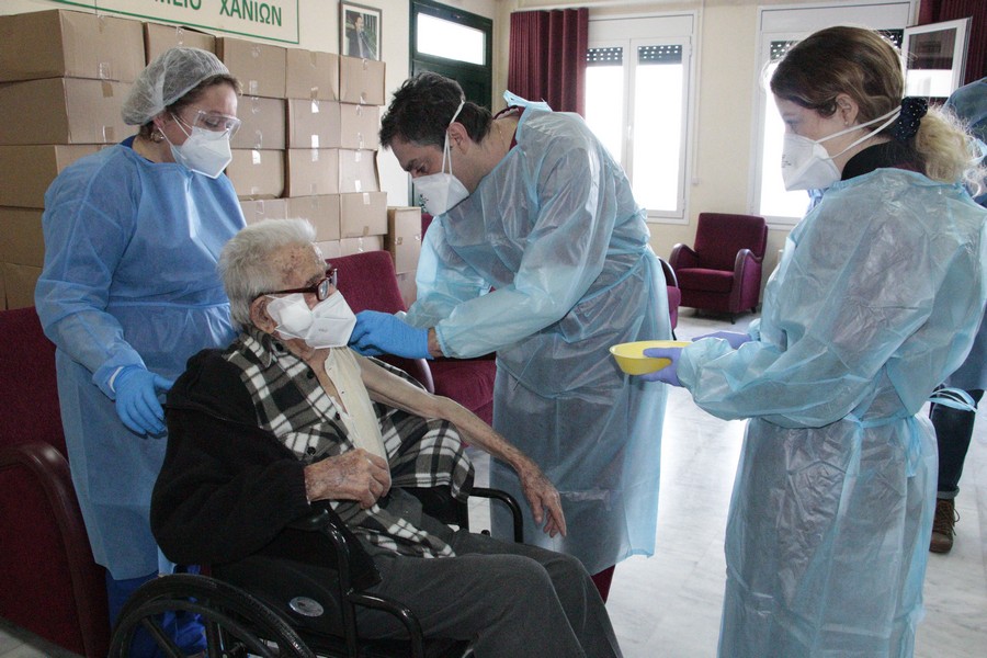 Κλιμάκιο των Κινητών Ομάδων Υγείας (Κ.ΟΜ.Υ.) Χανίων, αλλά και απεσταλμένοι του ΕΟΔΥ από την Αθήνα, βρέθηκαν στην ειδικά διαμορφωμένη αίθουσα του Δημοτικού Γηροκομείου όπου πραγματοποίησαν τη χορήγηση του εμβολίου στο σύνολο των φιλοξενουμένων και του προσωπικού της δομής.