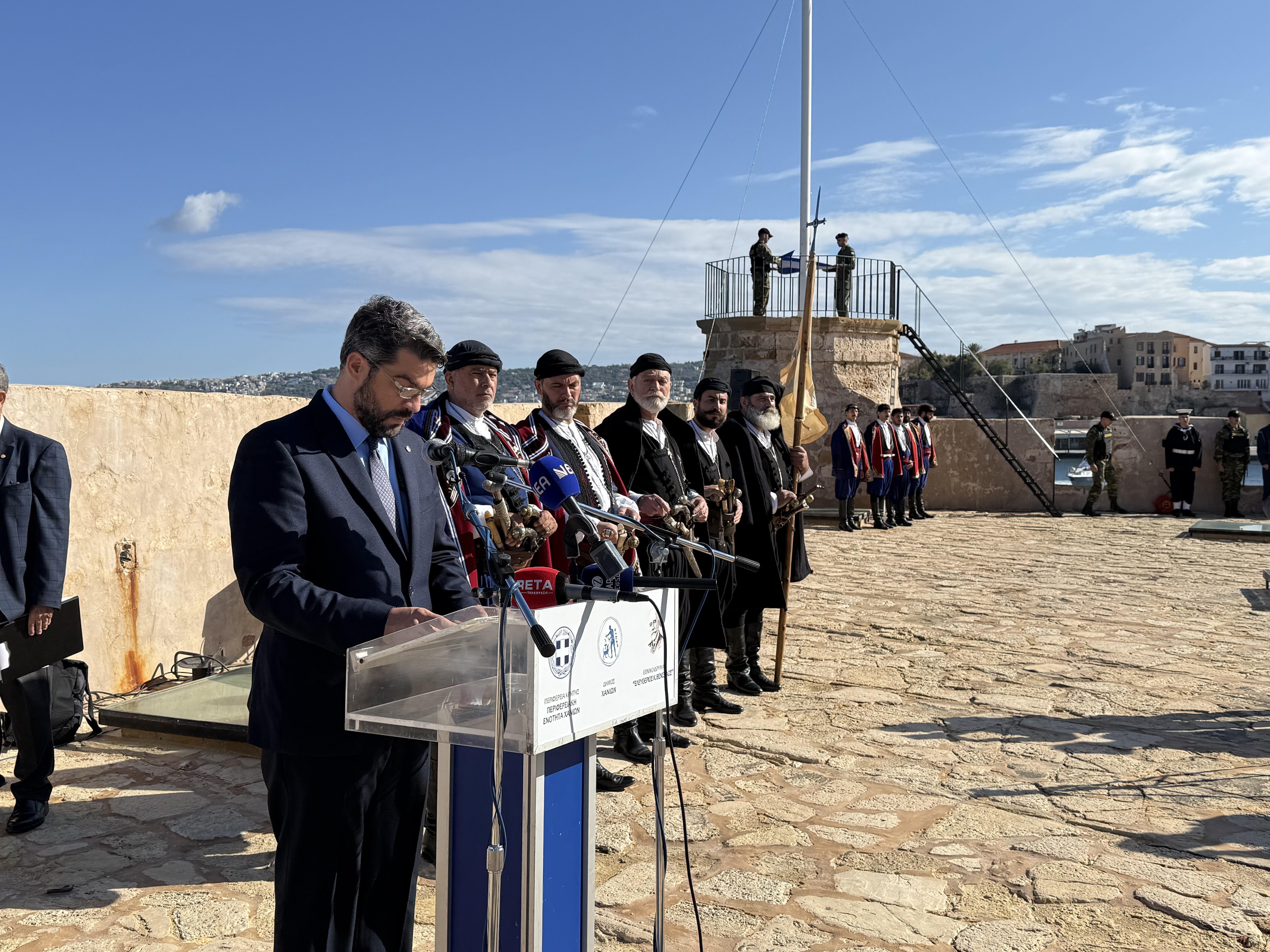Εκεί παρευρέθηκε και ο Δήμαρχος Χανίων, Παναγιώτης Σημανδηράκης, ο οποίος εκφώνησε τον πανηγυρικό της ημέρας για τη μεγάλη επέτειο για ολόκληρη την Κρήτη.