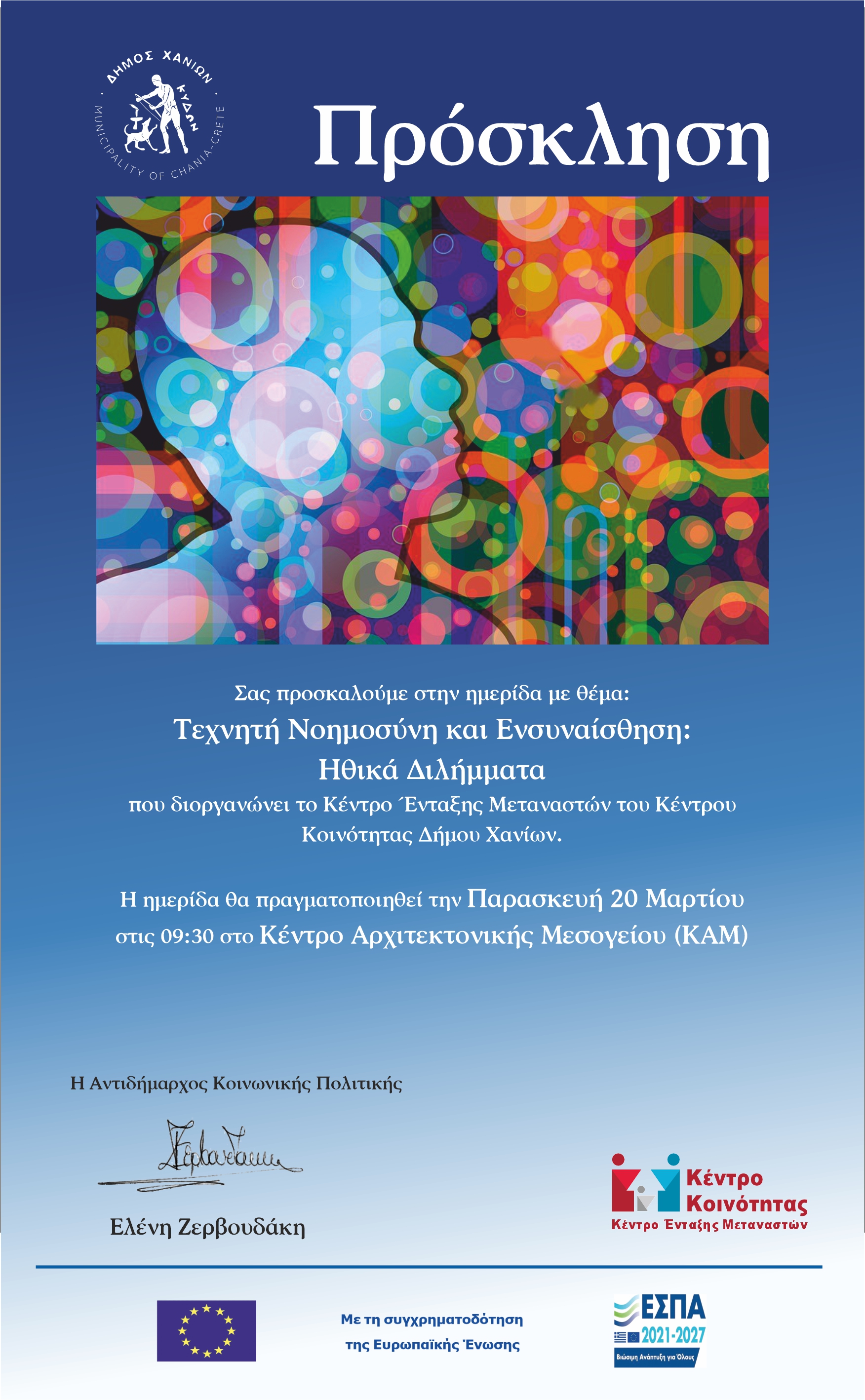 Το Κέντρο Ένταξης Μεταναστών του Κέντρου Κοινότητας Δήμου Χανίων διοργανώνει ημερίδα με θέμα «Τεχνητή Νοημοσύνη και Ενσυναίσθηση: Ηθικά Διλήμματα», την Παρασκευή 20 Μαρτίου στις 09:00, στο Κέντρο Αρχιτεκτονικής Μεσογείου (ΚΑΜ).