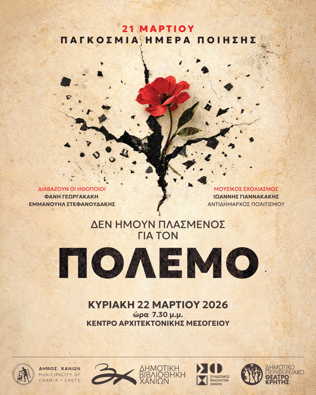 Ο Δήμος Χανίων, η Δημοτική Βιβλιοθήκη Χανίων, το Δημοτικό Περιφερειακό Θέατρο Κρήτης (ΔΗ.ΠΕ.ΘΕ.Κ.), ο Σύνδεσμος Φιλολόγων Νομού Χανίων και το Κέντρο Αρχιτεκτονικής Μεσογείου, με αφορμή τον εορτασμό της Παγκόσμιας Ημέρας Ποίησης, συνδιοργανώνουν ποιητικό αναλόγιο με τίτλο: «Δεν ήμουν πλασμένος για τον πόλεμο», την Κυριακή 22 Μαρτίου 2026 και ώρα 19:30, στο Κέντρο Αρχιτεκτονικής Μεσογείου (Κ.Α.Μ.).
